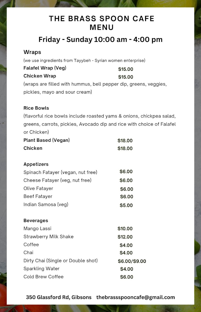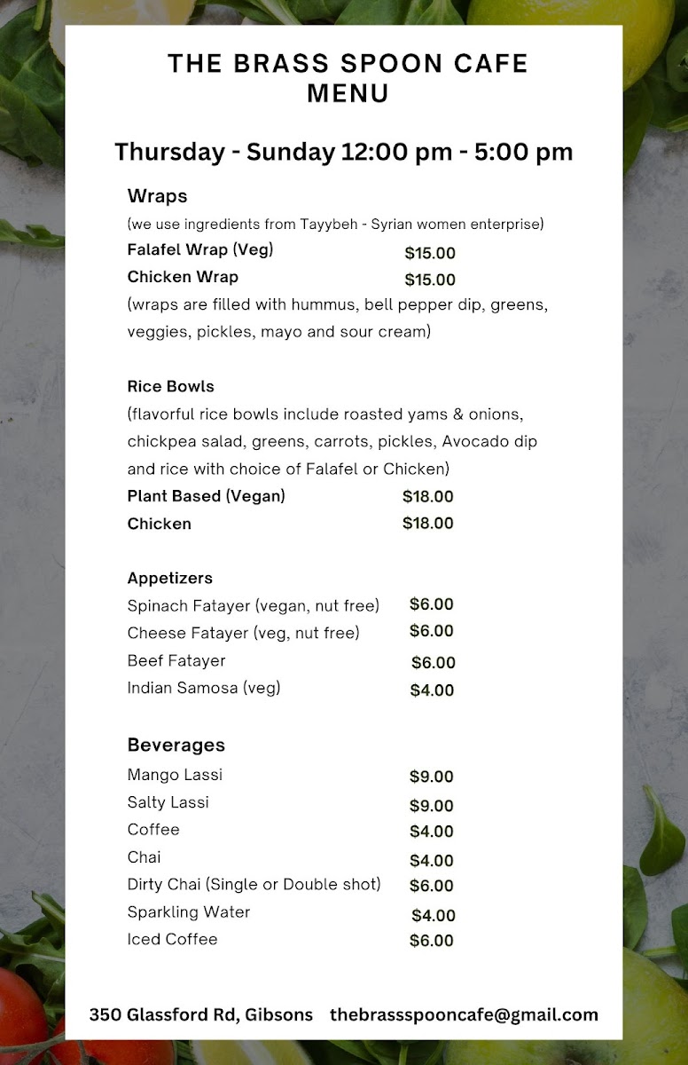 Welcome to The Brass Spoon Cafe, a delightful gem nestled at 350 Glassford Rd, Gibsons, BC. This charming cafe promises a menu filled with wholesome and vibrant dishes that celebrate local ingredients and flavors. The wraps are a must-try; choose between the Falafel Wrap or the hearty Chicken Wrap, both accompanied by creamy hummus and pickles for CA$15.00. For a nourishing meal, indulge in the Soulful Bowlful rice bowls, available in both plant-based and chicken options, loaded with roasted yams, chickpea salad, and avocado dip for CA$18.00.